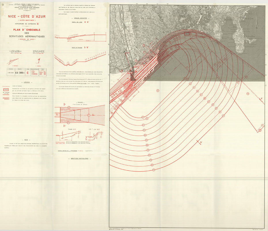 – Planes. Lots of them (one of the busiest airport in France), which you can see take off and land, as the runways seem an aircraft carrier; you feel you can almos touch them, as here the approach is curved (I never saw something like that, at least in Spain), and this makes traffic all the most spectacular. The aeronautical servitudes map seems an Enric Miralles’s architecture.