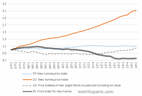 - A comparison between the charts of the home prices, in national average, in Spain, Colombia, France and the United States, by quarter, from the first 2007 to the second 2014, taking the valuest of 1st quarter 2007 as 100%. It is clear that France has not seen a drop in home values (a reduced residential output), in the US the 10% correction seems over (even if the difference in country size probably would deserve a more detailed analysis, and Colombia has a chart clearly reminding that of Spain five years earlier, something that doesn’t seem good.