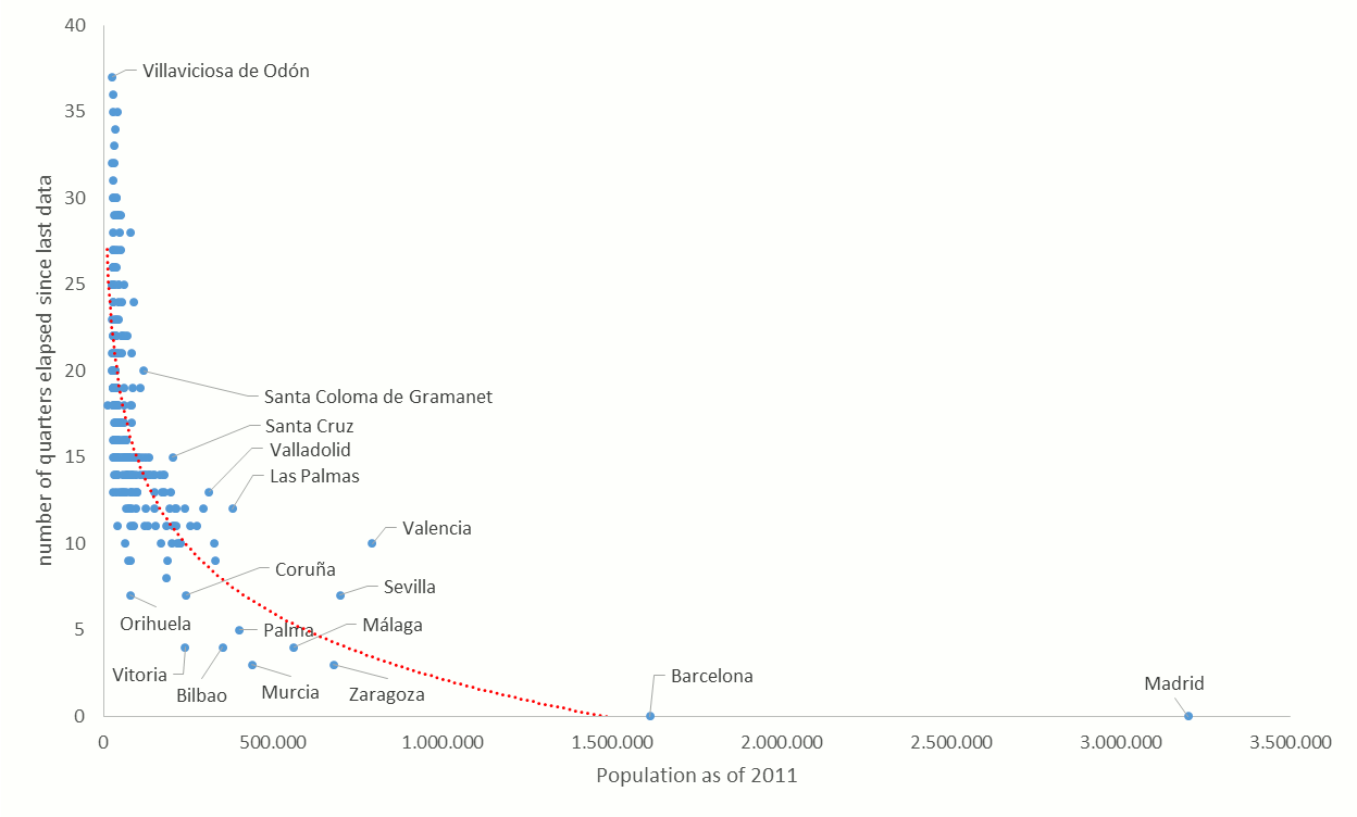 The end of what has been called the real-estate bubble has not been homogeneous on the land. This can be analysed in many ways, and this is how I did it. The Ministerio de Fomento, the Spanish Government’s body more related to housing (an attribution of the regions) publishes each quarter data on the evolution of the selling price of the sq m of housing, for a set of 283 municipalities over 25.000 residents, recording differences between homes completed less than 2 years before and the older stock. I did not focus on price itself, but rather on when there has been a “blackout” in data due to a lack of statistic representatively of available data. I’m fully aware that there are other resources, authored by private agents, that have different data, but I chose this one as it is public and everyone can use it, and it also has chances to stay active for some time. A remark for those willing to use the source: for the analyzed period (first quarter 2005- third of 2014) a municipality was added to the list; I used an homogeneous series excluding that one.