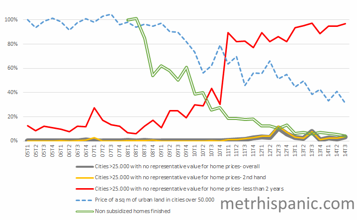 - A chart of the evolution by quarter of the number of cities without statistically representative values for the price of homes overall (no age class distinction), and for those under 2 years old (new homes). It is clear that in 2009 things became complex, and that the first quarter of 2011 became a clear threshold. By comparing the chart to the evolution of free homes (homes sold in a free market without public subvention to purchase) completed and the average price of a sq m of urban land in municipalities over 50.000, there are many parallels. Homes under 2 years old reduce, as there are no longer produced in large amounts.