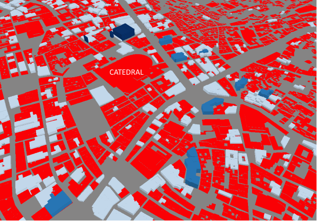 The results of a little escapade on the side of the cadastral data for volumes. If it is built, it must be drawn to ask for taxes… and those bases can be used. Here, around the Granada cathedral, that despite its imposing physical volume is considered by the Cadastre as one level building (albeit one with high ceilings…). On the first image, what can be seen at street level. On the second one, the volumes that are completely hidden (deep red is for buildings that according to data have no underground levels). These images don’t portray what happens in the intermediary situation, i.e., when the floor of a room is under the street level but its ceiling is above it, but for not more than a meter (to be seen soon, as it is interesting in a hilly city as Granada…).