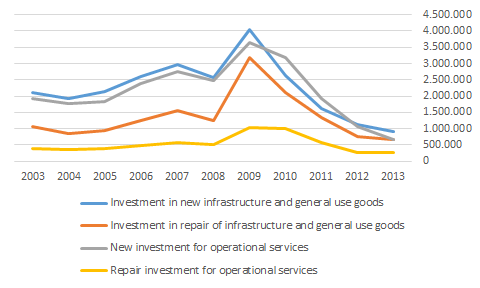 Investment: the investment on new infrastructure and general use goods was almost 7% in 2003, and it has gone down to 2,2% in 2013. When it comes to maintain these infrastructure and goods we have gone from 3,4 to 1,6% over the same period, and new/maintenance costs for operational services have followed a similar pattern.