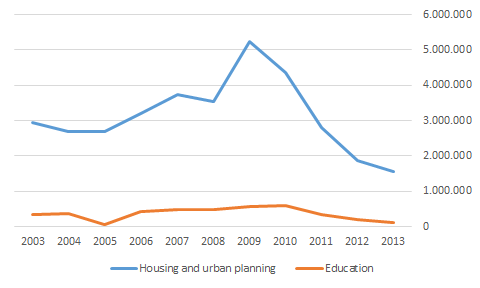 Detailed investment: the real investment (not taking into account personnel costs and other elements) of the Spanish municipalities has followed a more complex curve. Up to 2010 this real investment was over 25% of the total expenditure, but since then they have lost weight (9,4% in 2013). Urbanism and housing were around a third of real investment up to 2010, and since they have increased to reach 44% in 2013, even if the absolute figure is half that of 2003. To give an order of magnitude, education (in which local administrations have a limited role) went down from 4% to 3% over that period, and its absolute value was reduced to a third of the 2003 figure.