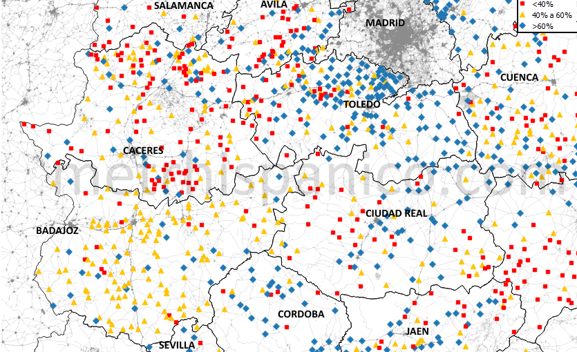 The Encuesta de Infraestructuras y Equipamientos Locales is a periodical survey in Spain which lets us know the state of infrastructures and public facilities in municipalities under 50.000 residents. According to the 2013 edition (the most recent available, which does not include some provinces in the map as Madrid or Huelva, at least for this topic), here is the municipal figure for the ratio between the capacity of kindergartens and the number of kids attending class in each settlement. Red squares are less than 40%, orange triangles 40% to 60%, and blue rhombus over 60%. No need to browse the absolut values (often depressing) to see clearly that the core of the Iberian peninsula is getting empty. Note, however, that as Madrid has no data in 2013 the map is misleading, as the region is quite different (just see how many blues nearby)