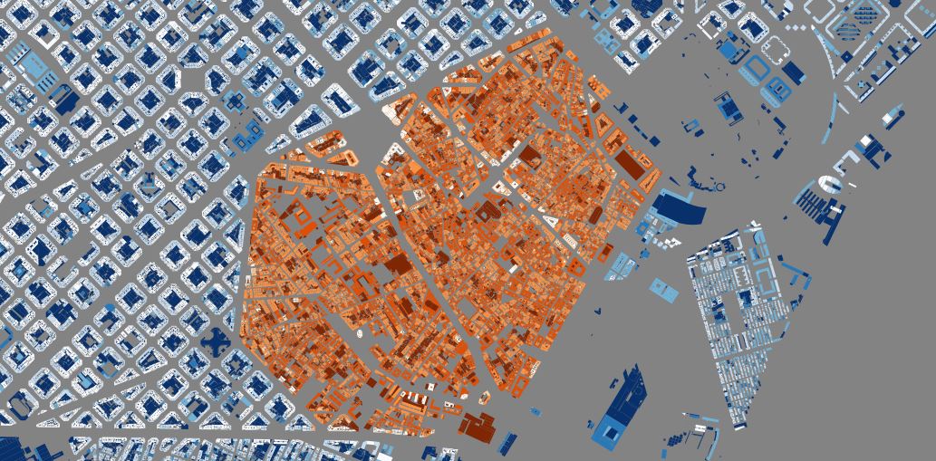 French geographer Yves Lacoste used to say that geography is since its inception a war tool. It’s not my aim to contradict him, but in fact urban cartography is since its inception a tool to levy taxes… here are the primary results of processing the cadastral maps of Barcelona by assigning a 3 m height…