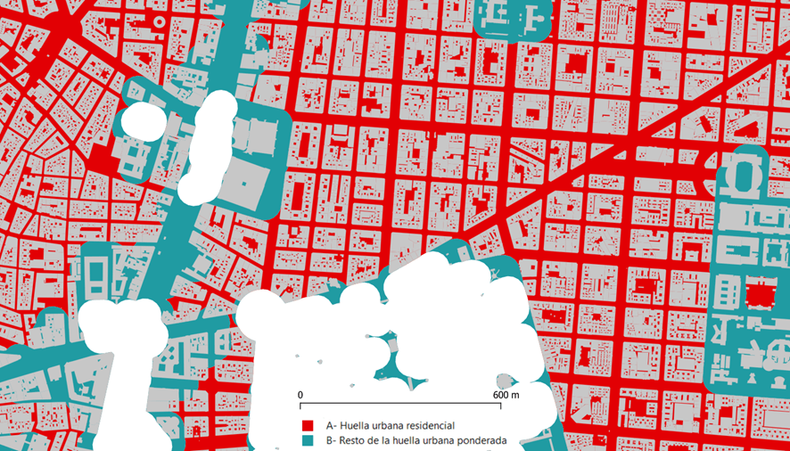 On the other hand, the residential urban footprint will be defined with a geometric operation similar to the previous one, but taking only the buildings in which the main use is residential. This makes it possible to differentiate within the weighted urban footprint those areas that have other uses that contribute to the development of urban functions in interrelation with housing.