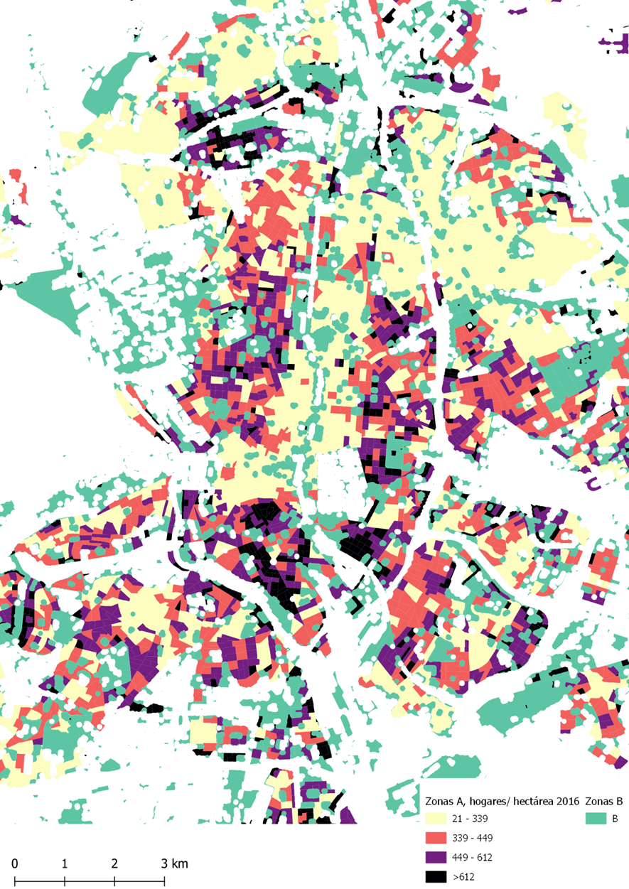 Fig.03 Household density per hectare in 2016 in zones A of the central area of the municipality of Madrid. Prepared by the author based on cadastral data and data from the National Institute of Statistics.