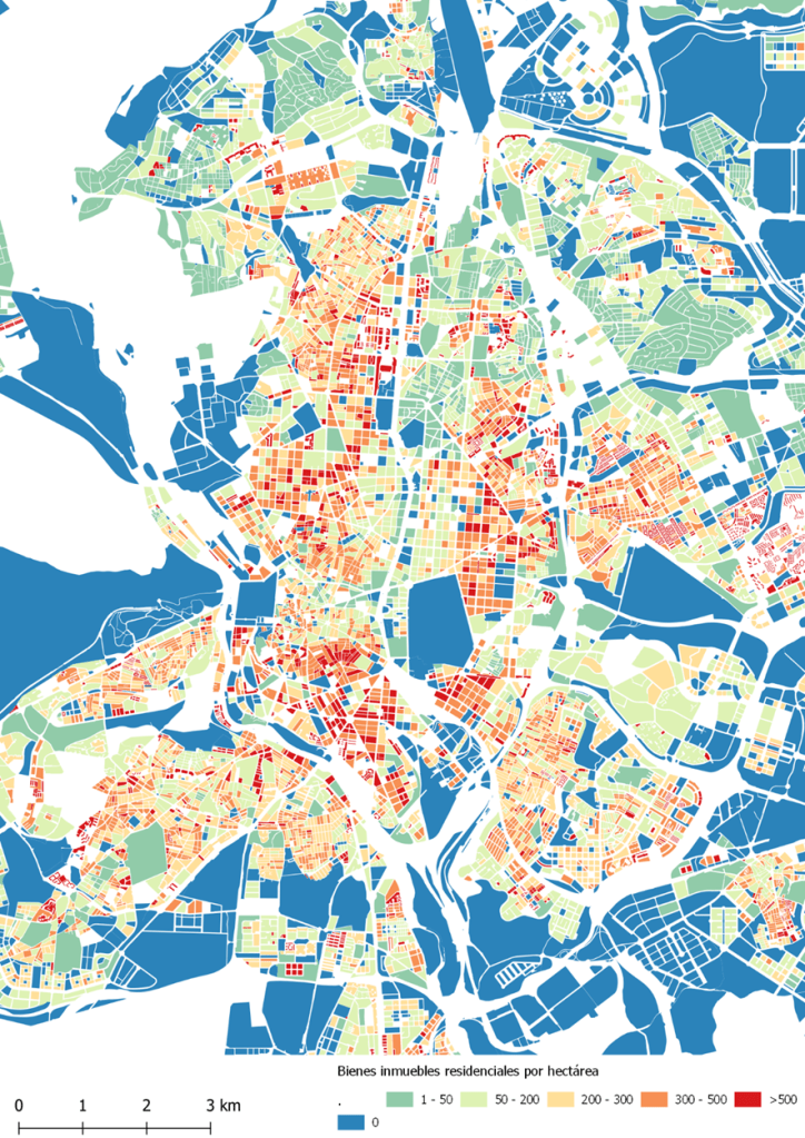The analysis of the density of residential property by block shows nuances that are not always appreciable in census data, aggregated on a larger scale. The Central District has relatively low densities except on its northern and southern edges, the east of the Salamanca district is clearly differentiated from the west from the axis of Príncipe de Vergara, and Tetuán shows higher values in its southeastern area. Arganzuela and Pacífico also have high values, as well as certain areas of Carabanchel, and in the same way the surroundings of the La Vaguada shopping centre stand out. In contrast, lower densities are clearly seen in the northern areas.