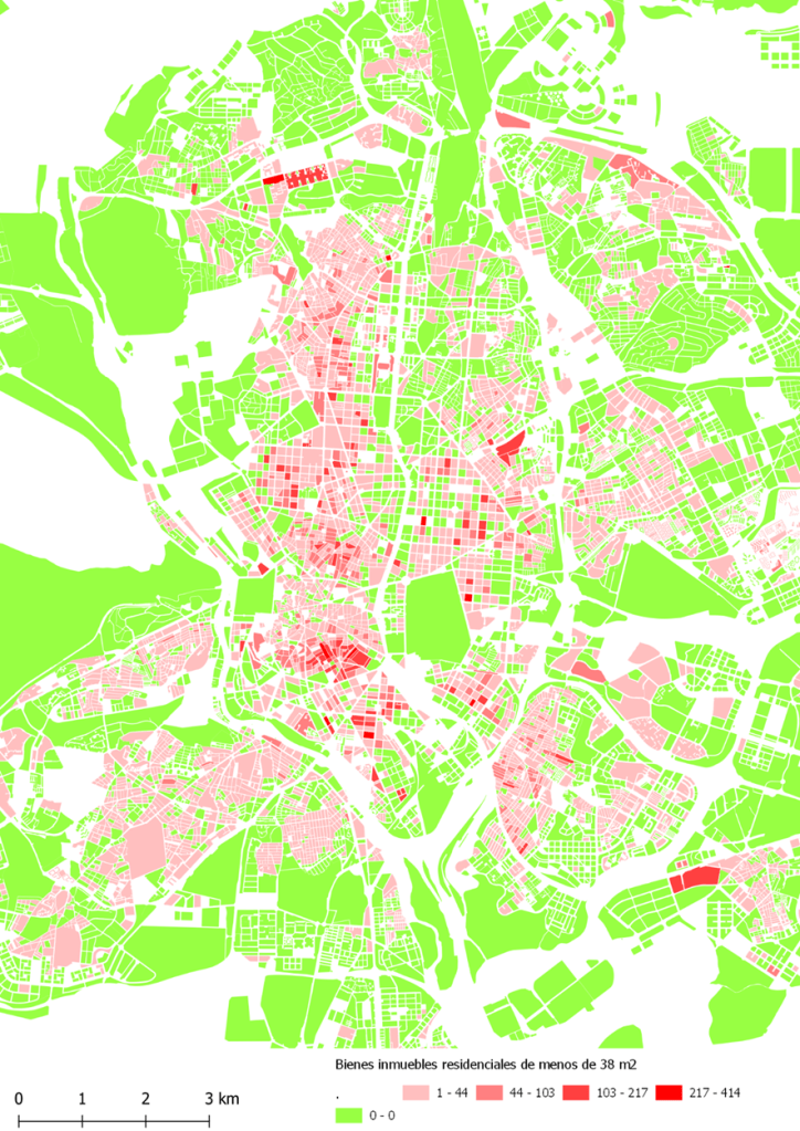 The map of residential property with less than 38 sq m built shows a special concentration in the south of the Central District, in Arganzuela, in parts of the Salamanca and Chamberí neighborhoods, in the area around La Vaguada, in Avenida de América and areas near Vallecas-Villa in which residential uses are being implemented on previously industrial plots.