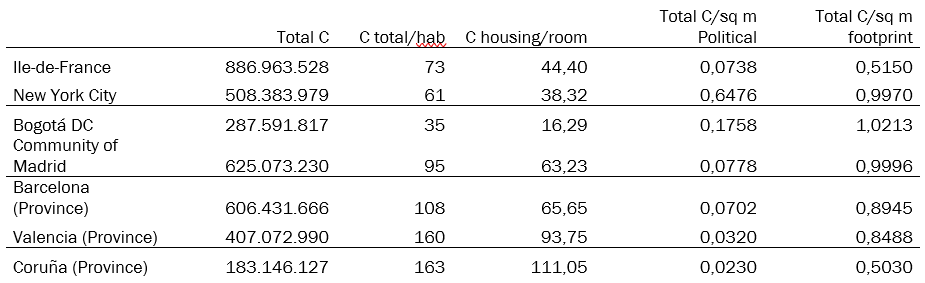 According to the morphological criteria used, the weighted built footprint of the Community of Madrid has a density almost equivalent, in global terms, to that of the central areas of New York or Bogotá, while the provinces of Barcelona and Valencia have somewhat lower, but equally high, values. However, the province of A Coruña and the Île-de-France Region have much lower values, which can be associated with more pronounced dispersion dynamics.