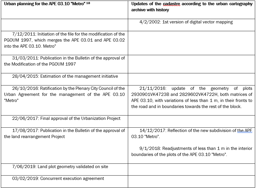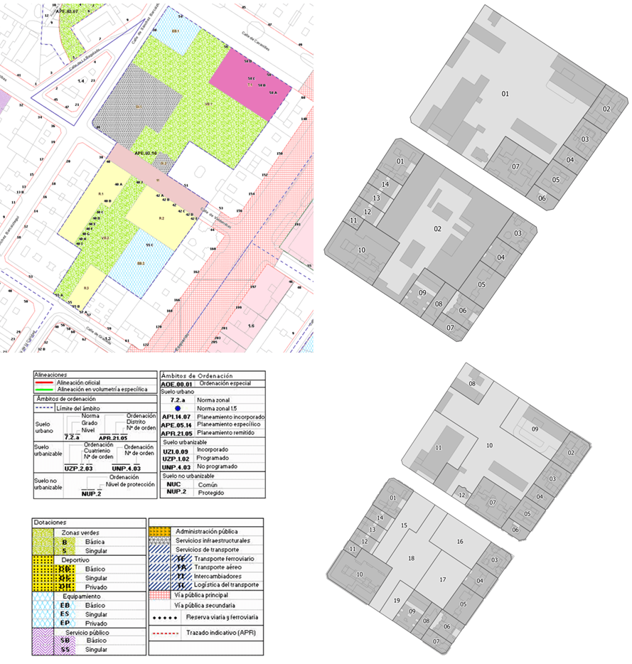 As a basis for fieldwork, cadastral data is contrasted with sources such as those provided by the Madrid City Council’s urban planning portal, available at address http://www-2.munimadrid.es/urbanismo_inter/visualizador/index_inter.jsp. The cadastral description of the southern block currently comprises 18 plots, after the division through the APE 03.10 “Metro) of the old plot 02, and the north has 11 plots, after the division into four of the old number 01 through the same operation. The temporal sequence of records on planning and cadastre in this area is as follows: