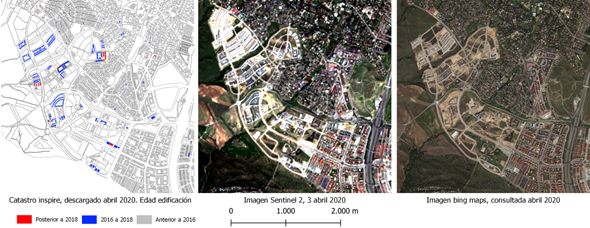 A more detailed analysis of the area of Boadilla del monte by contrasting open data of public origin with a common aerial photography access service, such as Bing maps, shows a certain delay in the reflection of the building data that can be presumed in the image of Sentinel 2 in the cadastre in its publication in Inspire format. This, in turn, corresponds to the extraction of the data on October 25, 2019, which is why it has a delay with respect to the version represented in the cadastral viewer as of April 2020, which leads to an underrepresentation of more than 50,000 sq m built. And in any case, it is clear that the image represented by Bing maps, which is one of the forms of access with the lowest barrier to entry, has a lag with respect to reality of more than 2 years; the verification of the images published by Google maps shows that the latter are surely from 2019.