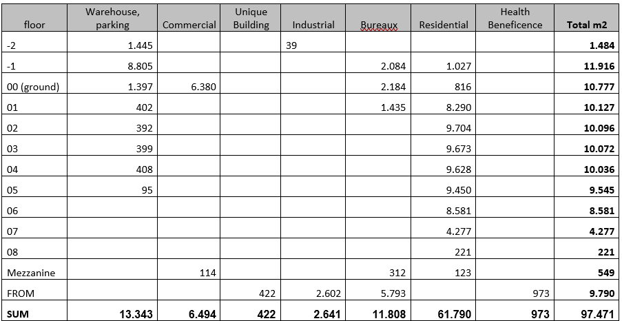 The data on the buildings show the presence of 2007 records of construction units, of which 5, corresponding to the plots of the southern block in the process of construction, register 0 units and surface area 0. For the remaining 2,002 registrations, 758 correspond to housing use, with a total of 54,730 sq m built specifically for these dwellings and 60,380 sq m built for the residential assets in which they are included (with common parts and associated elements within the real estate). In the description of the distribution by floor of the uses, up to 2 basements and 8 floors above ground are coded, as well as mezzanines, and the plots belonging to the APE are coded with an EU floor. The summary of the data by floor and usage is as follows: