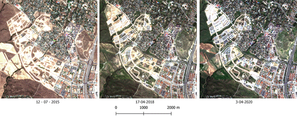Figure 3. Evolution of the images of the western area of Boadilla del Monte obtained by the constellation Sentinel 2 for July 12, 2015, April 17, 2018, and April 3, 2020