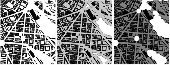 Figure 1. Methodology for tracing the work footprint. From left to right: floor plan occupation of the buildings according to cadastral mapping, buffer of 50 m to the outside, final result after buffer of 50 m to the inside
